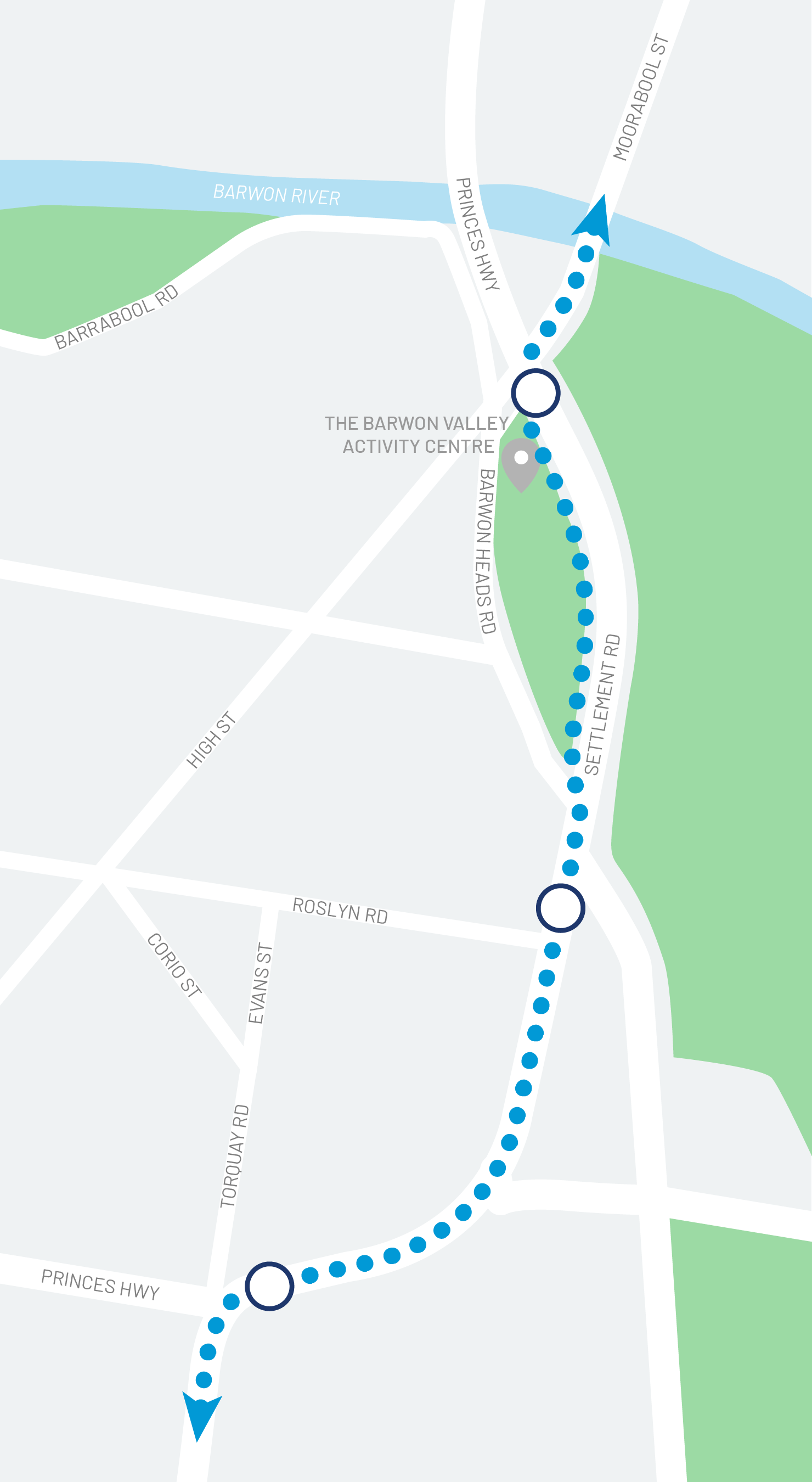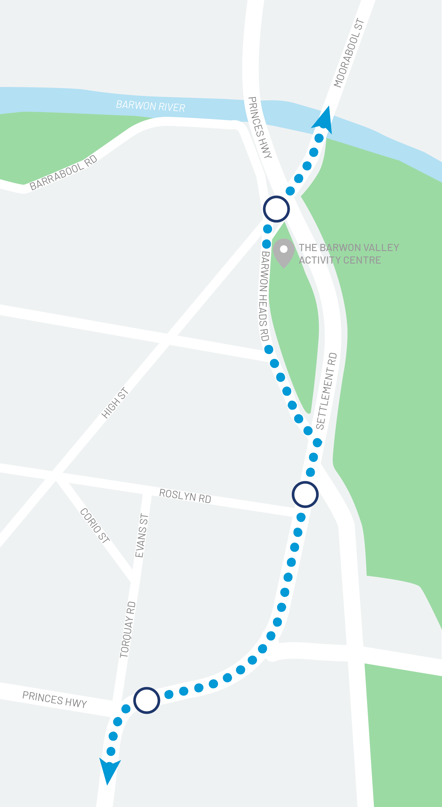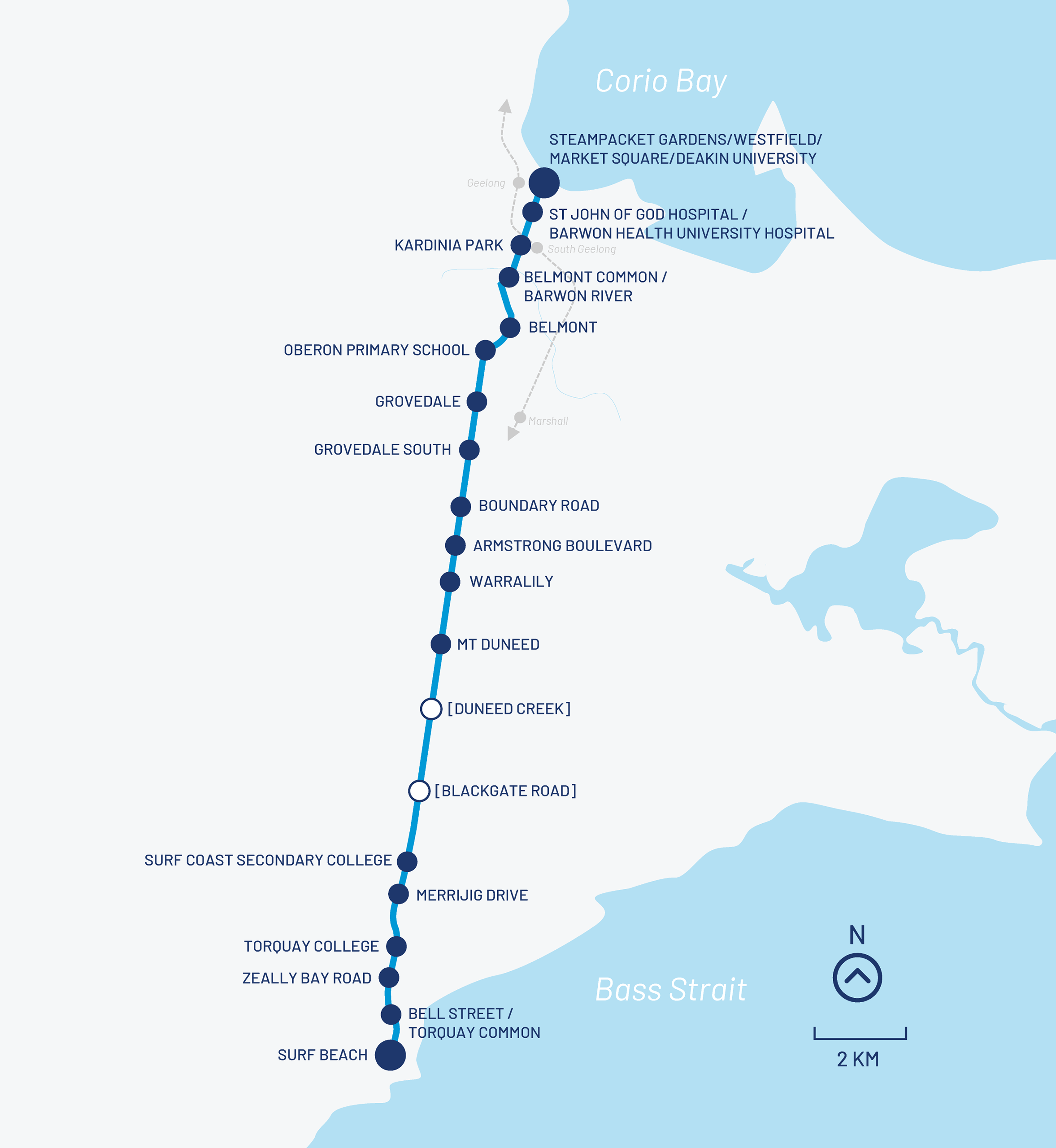 Linking the Geelong foreshore (Corio Bay) directly to Torquay (Surf Beach), the proposed route for Bay to Beach Connection is via Moorabool Street, High Street/Barwon Heads Road and Surf Coast Highway, with 18 stops spaced at intervals of about one-kilometre and connections to Geelong and South Geelong rail stations